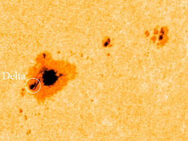 Image: Sunspot region 2297 as seen by SDO. The delta structure has been highlighted with a circle.