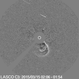 Animation: SOHO LASCO C3 imagery showing the coronal mass ejection that was launched by the long duration C9 solar flare.