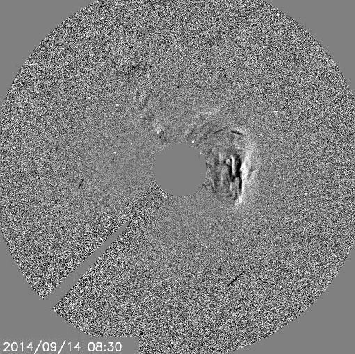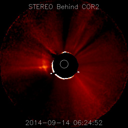 Coronagraph imagery from STEREO Behind (image below) shows that the solar flare is associated with a faint Coronal Mass Ejection. SDO/AIA 211 difference footage (image above) seems to confirm this. We are waiting for coronagraph imagery from SOHO to see if there is an Earth-directed component but it is likely that the CME is directed away from Earth if you consider the location of the solar flare which occured at S14W53. More information will be added to this post when available.