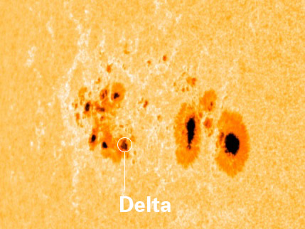 Below you will find an image of sunspot region 2443 in visible light as seen by the NASA Solar Dynamics Observatory. Our analysis shows that this sunpot region has a delta sunspot located in the trailing area of this sunspot region. This means that this sunspot region has a very clear Beta-Gamma-Delta magnetic layout. M-class (R1-R2) activity is possible in the coming 24 hours.