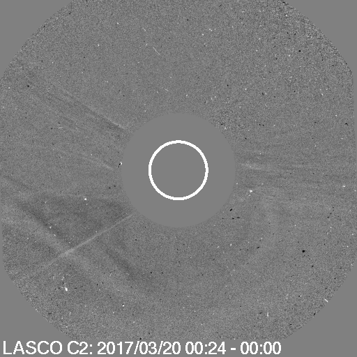 I hear you ask: why is this significant? Well, this is a classic sign of an approaching shock wave from an interplanetary magnetic cloud. In fact, we were aware of the solar eruption which took place back on 19 March from an area south of the earth-facing coronal hole (see the header image) however the cloud is very faint on the images from the SOHO LASCO coronagraph. A faint partial halo can be spotted but the plasma cloud looks to be heading mostly south of the ecliptic. We originally choose to not mention it because we thought there would be a decent chance that the plasma cloud would miss us and/or hardly be noticeable once it arrives but now that the low energy protons are on the rise, we might have underestimated the situation and that it is indeed likely that we will see a glancing blow at Earth. The SOHO/LASCO C2 animation below shows the coronal mass ejection as it leaves the Sun. You have to look very closely, it is not easy to spot!