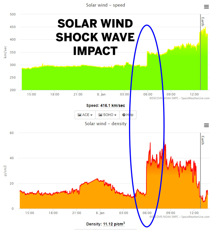 A coronal hole solar wind stream was expected but not of this magnitude due to the high latitude of the coronal hole. Such clear shocks with a very sharp increase in the solar wind speed/IMF (Bt) are usually associated with the arrival of an interplanetary magnetic cloud, also better known as a coronal mass ejection. The catch is: there were no known coronal mass ejections on the way to Earth.