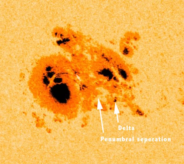 Sunspot region 2192 reached a size of 2400 millionths today according to the NOAA SWPC making it the largest sunspot region of this solar cycle and the largest sunspot group since sunspot region 486 which was the source of several strong solar storms almost 11 years ago. Sunspot region 2192 has been producing several M-class solar flares since our last update but only one of those M-class solar flares occurred today. It was an impulsive M1.2 (R1-minor) solar flare that peaked at 13:38 UTC. None of the solar flares mentioned have produced a coronal mass ejection. In this news article we take a look at sunspot region 2192 and the current geomagnetic conditions.