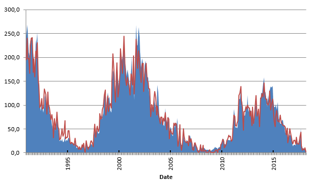 Figure 1. January 1991 – March 2018. The blue values were calculated from the 10.7 cm radio flux and fit relatively well with the observed sunspot number (red) Source: S.I.D.C. Brussels International Sunspot Number. 10.7cm radio flux values (sfu): Penticton, B.C., Canada.