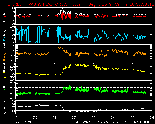 We do see that the coronal hole changed in shape quite dramatically during its trip around the far side of the Sun. It still covers an impressive area but it lost its T-shape. It does however now connect all the way up to the northern hemisphere polar coronal hole. Does that mean we should again expect moderate storm conditions? Perhaps... lets look at the data from STEREO Ahead to see what we should expect: