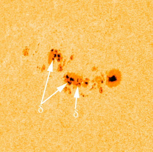 In the latest imagery from SDO we can indeed conclude that multiple delta structures are present within the central and trailing parts of this sunspot region. The opposite polarity sunspots are close to the other polarity making it a compact and complex region that harbors energy for more M-class solar flares (R1-R2) and even a small chance for a low-level X-class (R3) event. This sunspot region is not yet in a great geo-effective position but it is now rotating more and more into a better position for any eruptions to be earth-directed.