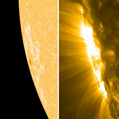 Old sunspot region 2192 (source of six X-class solar flares) is now rotating into view and it is not looking good. It looks like this once massive sunspot region which grew to became the largest sunspot region in 24 years has decayed to almost a spotless plage. We can see large amounts of faculae now near the SE limb with only one sunspot. It is of course possible that there still are sunspots hiding behind the limb but it really looks like most of this once mighty sunspot region has decayed. If there are more sunspots still behind the limb they should become visible within the next 24 hours. We will keep you updated in case a significant sunspot cluster becomes visible tomorrow.