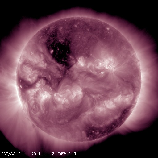 There are currently no coronal mass ejections on the way to Earth or any coronal holes facing Earth. There is however a large nothern hemisphere coronal hole rotating slowly towards the central meridian but it will still take at least 6 days before we see any effects from it near Earth.