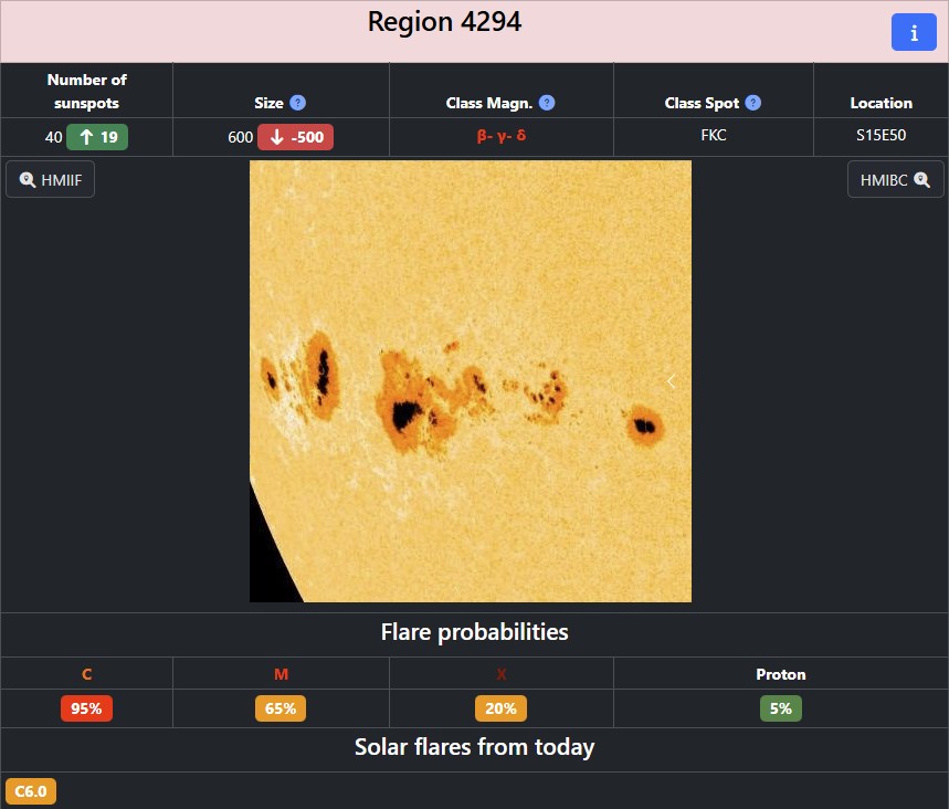 Another sunspot region to keep an eye on is located on the Sun's southern hemisphere. We are of course talking about large sunspot region 4294 which has a Beta-Gamma-Delta magnetic layout and produced 6 M-class events thus far. Another potential flare producer together with sunspot region 4299!