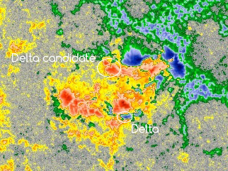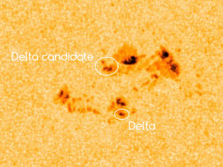 A quick look at sunspot region 2230 shows a sunspot group with a Beta-Gamma-Delta magnetic layout. It has a small delta sunspot among the southern sunspot cluster and spots of opposite polarities close to each other in it's nothern section but those can not be called delta sunspots just yet as they are not really connected with penumbra between the umbra spots. Do note that this sunspot region is constantly moving around and will likely change it's layout in the coming hours but it does look promising at the moment if it continues to develop and gain magnetic complexity. A low-level M-class solar flare can not be excluded based on it's current layout but the chances are not very high just yet.