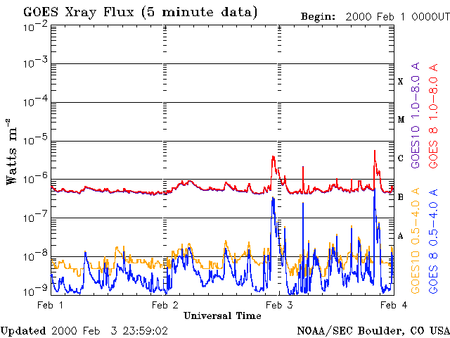 The operational data in the graph above has been modified to remove the scaling factor that has been applied by the Space Weather Prediction Center (SWPC). Because of the SWPC scaling factor in the operational data, flare indices for the operational data were reported as 42% smaller than for the science quality data. The scaling factor has also been removed from the solar flare list to reflect the true physical units.