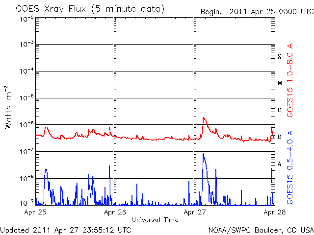 The operational data in the graph above has been modified to remove the scaling factor that has been applied by the Space Weather Prediction Center (SWPC). Because of the SWPC scaling factor in the operational data, flare indices for the operational data were reported as 42% smaller than for the science quality data. The scaling factor has also been removed from the solar flare list to reflect the true physical units.