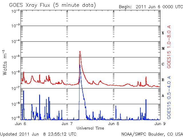 The operational data in the graph above has been modified to remove the scaling factor that has been applied by the Space Weather Prediction Center (SWPC). Because of the SWPC scaling factor in the operational data, flare indices for the operational data were reported as 42% smaller than for the science quality data. The scaling factor has also been removed from the solar flare list to reflect the true physical units.