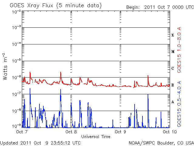 The operational data in the graph above has been modified to remove the scaling factor that has been applied by the Space Weather Prediction Center (SWPC). Because of the SWPC scaling factor in the operational data, flare indices for the operational data were reported as 42% smaller than for the science quality data. The scaling factor has also been removed from the solar flare list to reflect the true physical units.