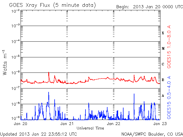 The operational data in the graph above has been modified to remove the scaling factor that has been applied by the Space Weather Prediction Center (SWPC). Because of the SWPC scaling factor in the operational data, flare indices for the operational data were reported as 42% smaller than for the science quality data. The scaling factor has also been removed from the solar flare list to reflect the true physical units.