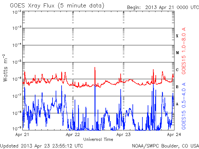 The operational data in the graph above has been modified to remove the scaling factor that has been applied by the Space Weather Prediction Center (SWPC). Because of the SWPC scaling factor in the operational data, flare indices for the operational data were reported as 42% smaller than for the science quality data. The scaling factor has also been removed from the solar flare list to reflect the true physical units.