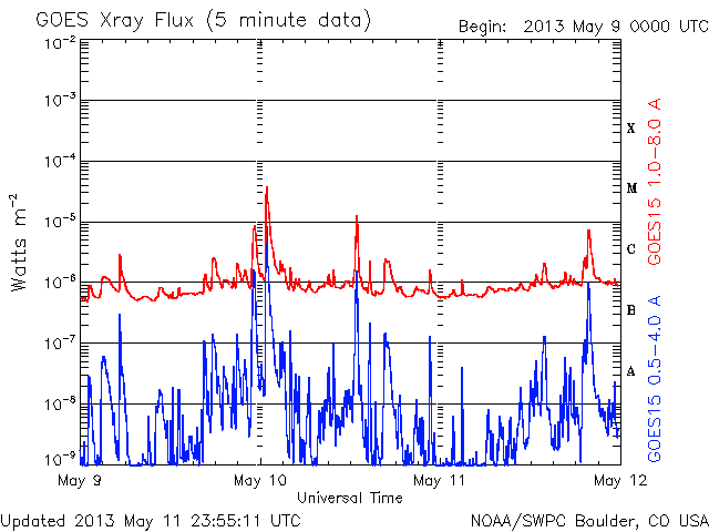 The operational data in the graph above has been modified to remove the scaling factor that has been applied by the Space Weather Prediction Center (SWPC). Because of the SWPC scaling factor in the operational data, flare indices for the operational data were reported as 42% smaller than for the science quality data. The scaling factor has also been removed from the solar flare list to reflect the true physical units.