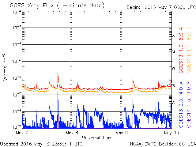The operational data in the graph above has been modified to remove the scaling factor that has been applied by the Space Weather Prediction Center (SWPC). Because of the SWPC scaling factor in the operational data, flare indices for the operational data were reported as 42% smaller than for the science quality data. The scaling factor has also been removed from the solar flare list to reflect the true physical units.