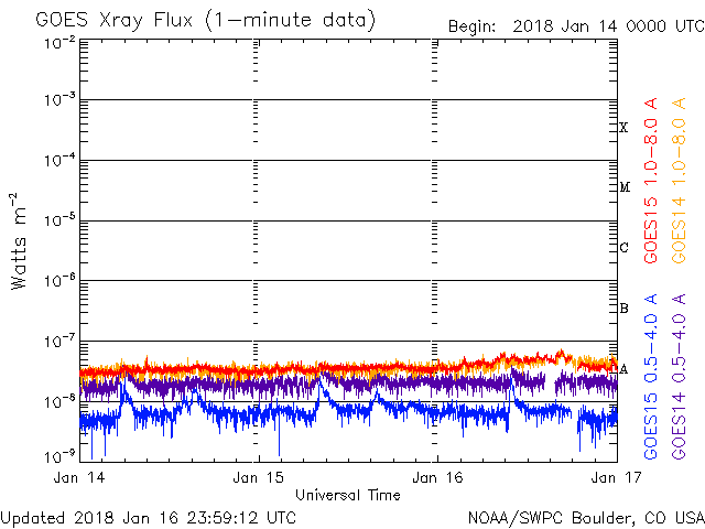 The operational data in the graph above has been modified to remove the scaling factor that has been applied by the Space Weather Prediction Center (SWPC). Because of the SWPC scaling factor in the operational data, flare indices for the operational data were reported as 42% smaller than for the science quality data. The scaling factor has also been removed from the solar flare list to reflect the true physical units.