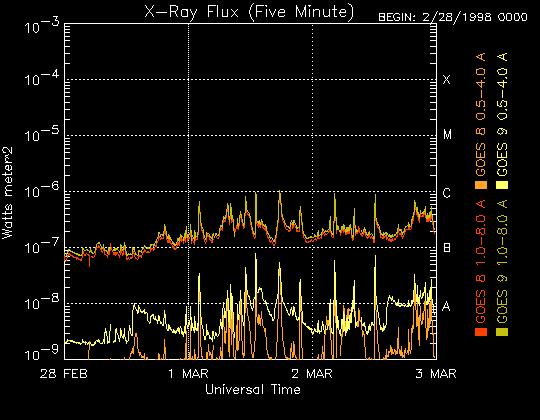 I dati operativi nel precedente grafico sono stati modificati per rimuovere il fattore di scala applicato dal Centro di Predizione Meteorologica Spaziale (SWPC). A causa del fattore di scala di SWPC nei dati operativi, gli indici di brillamento per i dati operativi sono segnalati come ridotti del 42%, rispetto ai dati di qualità scientifica. Il fattore di scala è inoltre stato ridotto dall'elenco dei brillamenti solari, per riflettere le unità fisiche reali.