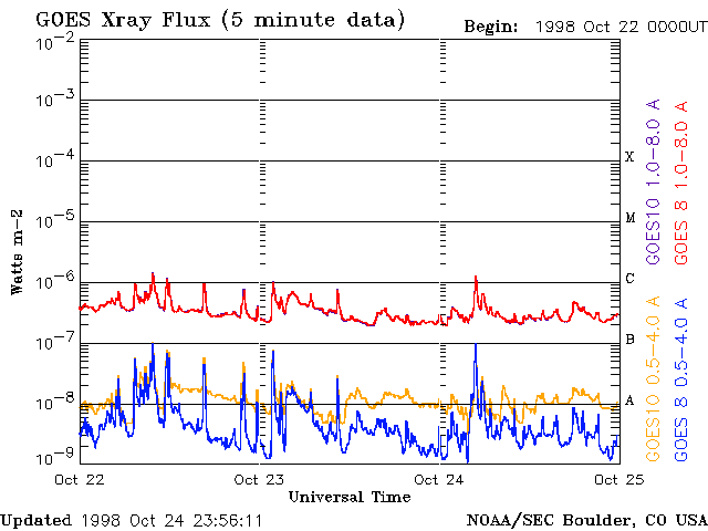 I dati operativi nel precedente grafico sono stati modificati per rimuovere il fattore di scala applicato dal Centro di Predizione Meteorologica Spaziale (SWPC). A causa del fattore di scala di SWPC nei dati operativi, gli indici di brillamento per i dati operativi sono segnalati come ridotti del 42%, rispetto ai dati di qualità scientifica. Il fattore di scala è inoltre stato ridotto dall'elenco dei brillamenti solari, per riflettere le unità fisiche reali.