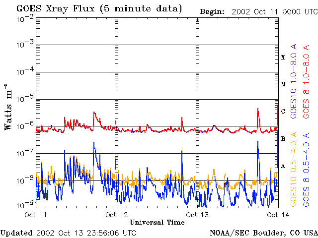I dati operativi nel precedente grafico sono stati modificati per rimuovere il fattore di scala applicato dal Centro di Predizione Meteorologica Spaziale (SWPC). A causa del fattore di scala di SWPC nei dati operativi, gli indici di brillamento per i dati operativi sono segnalati come ridotti del 42%, rispetto ai dati di qualità scientifica. Il fattore di scala è inoltre stato ridotto dall'elenco dei brillamenti solari, per riflettere le unità fisiche reali.
