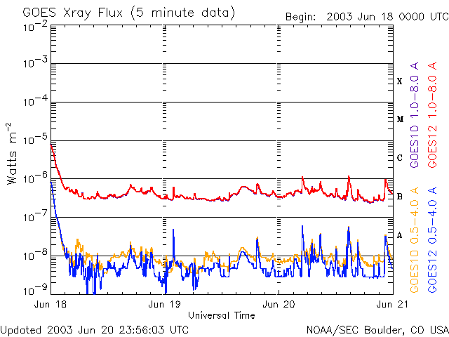 I dati operativi nel precedente grafico sono stati modificati per rimuovere il fattore di scala applicato dal Centro di Predizione Meteorologica Spaziale (SWPC). A causa del fattore di scala di SWPC nei dati operativi, gli indici di brillamento per i dati operativi sono segnalati come ridotti del 42%, rispetto ai dati di qualità scientifica. Il fattore di scala è inoltre stato ridotto dall'elenco dei brillamenti solari, per riflettere le unità fisiche reali.