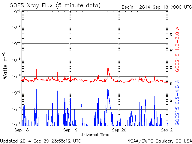 I dati operativi nel precedente grafico sono stati modificati per rimuovere il fattore di scala applicato dal Centro di Predizione Meteorologica Spaziale (SWPC). A causa del fattore di scala di SWPC nei dati operativi, gli indici di brillamento per i dati operativi sono segnalati come ridotti del 42%, rispetto ai dati di qualità scientifica. Il fattore di scala è inoltre stato ridotto dall'elenco dei brillamenti solari, per riflettere le unità fisiche reali.