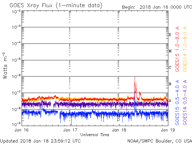 I dati operativi nel precedente grafico sono stati modificati per rimuovere il fattore di scala applicato dal Centro di Predizione Meteorologica Spaziale (SWPC). A causa del fattore di scala di SWPC nei dati operativi, gli indici di brillamento per i dati operativi sono segnalati come ridotti del 42%, rispetto ai dati di qualità scientifica. Il fattore di scala è inoltre stato ridotto dall'elenco dei brillamenti solari, per riflettere le unità fisiche reali.