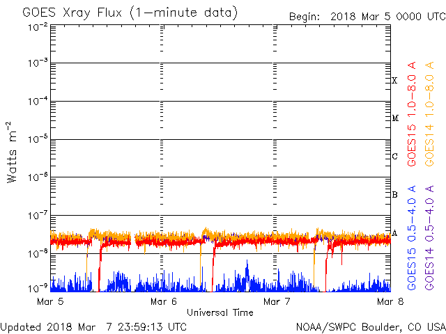 I dati operativi nel precedente grafico sono stati modificati per rimuovere il fattore di scala applicato dal Centro di Predizione Meteorologica Spaziale (SWPC). A causa del fattore di scala di SWPC nei dati operativi, gli indici di brillamento per i dati operativi sono segnalati come ridotti del 42%, rispetto ai dati di qualità scientifica. Il fattore di scala è inoltre stato ridotto dall'elenco dei brillamenti solari, per riflettere le unità fisiche reali.