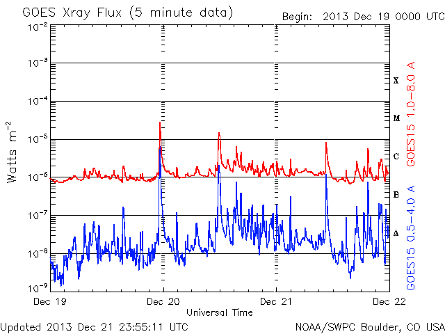 Оперативные данные выше были модифицированы, чтобы убрать масштабирующий фактор, который был применен SWPC (Центр предсказания космической погоды). Из-за этого фактора индексы вспышек в оперативных данных были занижены на 42% относительно научных данных. Масштабирующий фактор был так же убран из списка солнечных вспышек, чтобы отображать реальные величины.