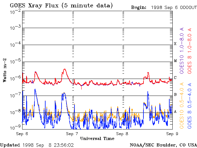 上圖中的操作數據已被修改,以刪除太空天氣預報中心(SWPC) 應用的比例因子。由於操作數據中的SWPC 比例因子,操作數據的耀斑指數報告比科學質量數據小 42%。比例因子也已從太陽耀斑清單中刪除,以反映真實的物理單位。