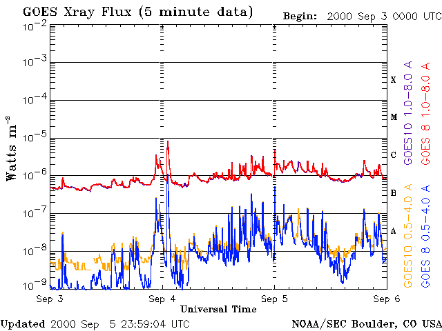 上圖中的操作數據已被修改,以刪除太空天氣預報中心(SWPC) 應用的比例因子。由於操作數據中的SWPC 比例因子,操作數據的耀斑指數報告比科學質量數據小 42%。比例因子也已從太陽耀斑清單中刪除,以反映真實的物理單位。